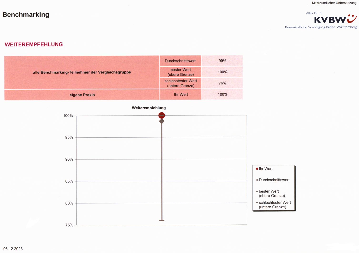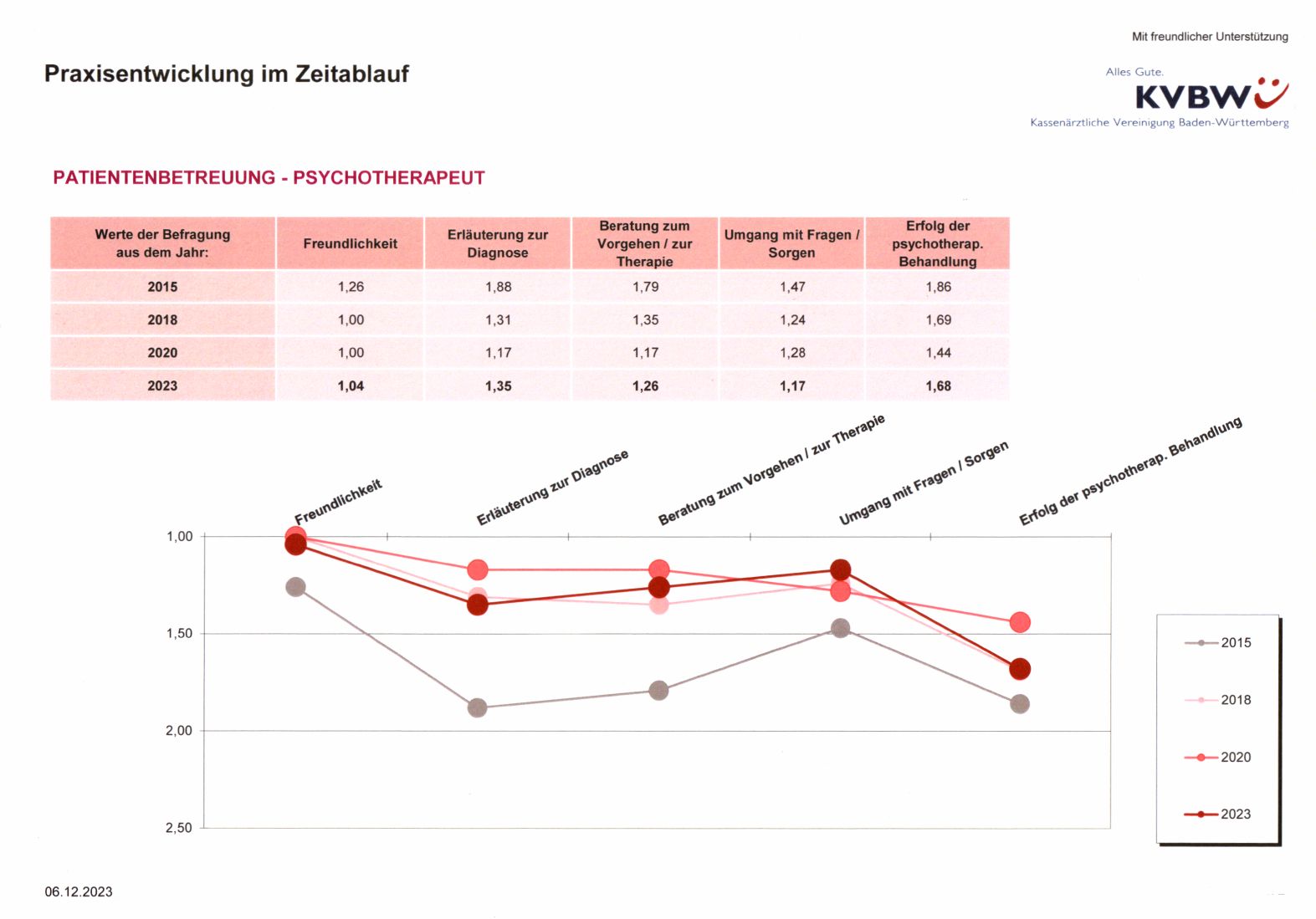 Seit Beginn meiner ambulanten Tätigkeit 2014 führe ich regelmäßig Patientenbefragungen zur Zufriedenheit durch. Diese wird von der Kassenärztlichen Vereinigung Baden-Württemberg unterstützt und ausgewertet. Dadurch konnte ich mein Vorgehen anpassen und die Zufriedenheit verbessern.